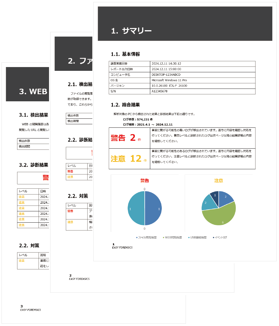 各調査結果を解析し、事案に繋がる可能性のあるログ件数と対象をレポート化します