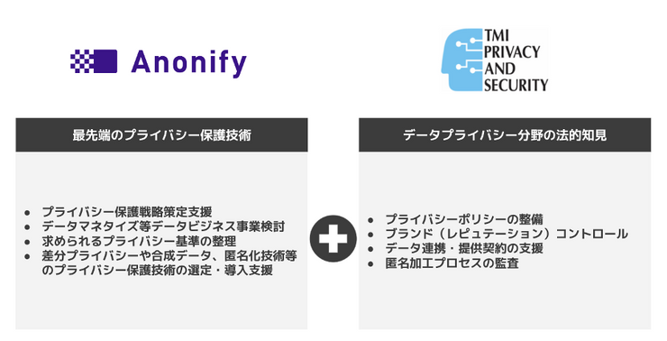同様に、TMI P&Sは、TMI総合法律事務所とともに、データプライバシー分野の法的知見を軸に「プライバシーポリシーの整備」「ブランド(レピュテーション)コントロール」「データ連携・提供契約の支援」および「匿名加工プロセスの監査」によって、法・レピュテーション・データガバナンス等の観点からパーソナルデータの流通・利活用を支援します。